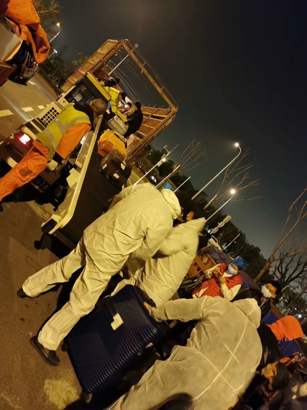 2月13日,(武漢)天河機(jī)場到了七架飛機(jī),有1600個醫(yī)護(hù)人員,從不同的城市過來,飯都沒吃,站在那里冷颼颼的。他們有很多行李,機(jī)場的人手不夠,我們就過來幫忙把這些行李運送到貨車上,然后再送到他們相應(yīng)的酒店,酒店會有志愿者幫忙卸行李。
