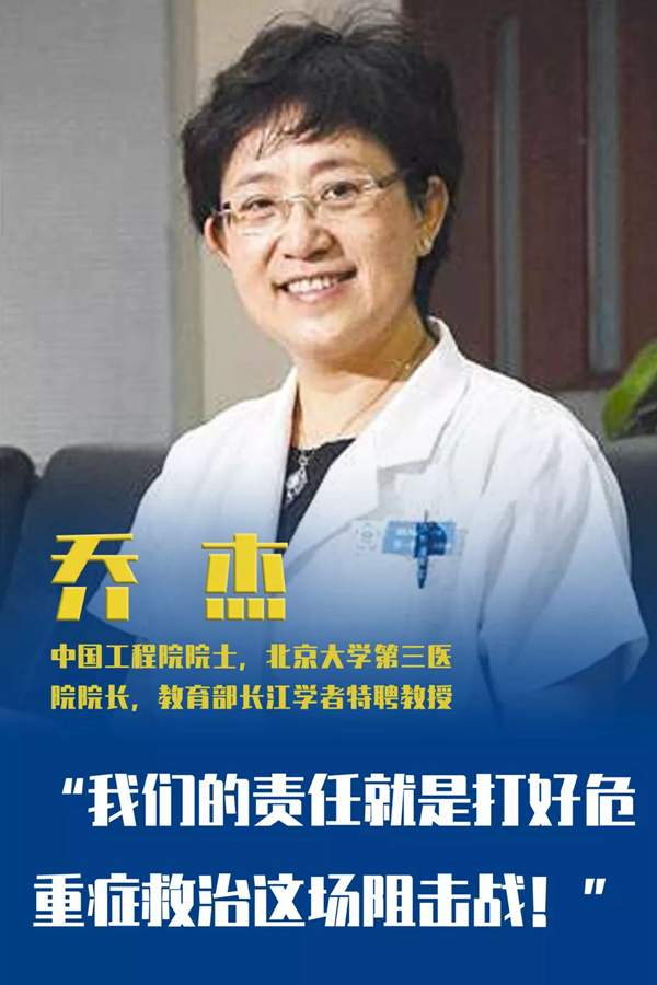 北京大學(xué)自創(chuàng)建以來(lái),始終與國(guó)家和民族同呼吸共命運(yùn)。此次新冠狀病毒感染疫情嚴(yán)重,情況危急。北大迅速派出附屬醫(yī)院的多批醫(yī)療隊(duì)馳援武漢。截止到2月13日,北大援鄂抗疫國(guó)家醫(yī)療隊(duì)已累計(jì)收治危重癥患者200余例,而作為領(lǐng)導(dǎo)組組長(zhǎng),喬杰也已在武漢駐守12天。她協(xié)同各院領(lǐng)導(dǎo)和專(zhuān)家組成員,迅速梳理工作流程,從管理體制建立、到病房改造,再到人員培訓(xùn),儀器設(shè)備調(diào)配,每一細(xì)節(jié)嚴(yán)格把關(guān)。她帶領(lǐng)團(tuán)隊(duì)充分發(fā)揮北大醫(yī)學(xué)多學(xué)科合作優(yōu)勢(shì),為提高新冠肺炎危重患者治愈率,降低病亡率履行著應(yīng)盡的職責(zé)。
