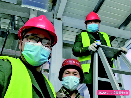 圖為2月12日李海軍(中)在雷神山醫(yī)院工地留影。新華社發(fā)(受訪者李海軍供圖)