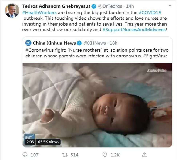 ↑世界衛(wèi)生組織總干事譚德塞轉(zhuǎn)發(fā)新華社海外社交媒體英文主賬號(hào)稿件《隔離點(diǎn)里的“臨時(shí)媽媽”》,贊譽(yù)中國(guó)醫(yī)護(hù)人員在新冠肺炎防治工作中付出的努力和愛(ài)心。