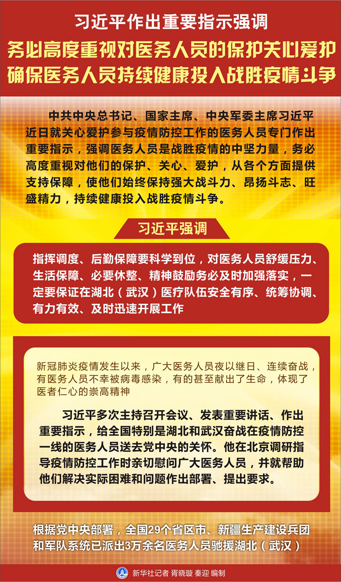 習(xí)近平強調(diào),指揮調(diào)度、后勤保障要科學(xué)到位,對醫(yī)務(wù)人員舒緩壓力、生活保障、必要休整、精神鼓勵務(wù)必及時加強落實,一定要保證在湖北(武漢)醫(yī)療隊伍安全有序、統(tǒng)籌協(xié)調(diào)、有力有效、及時迅速開展工作。