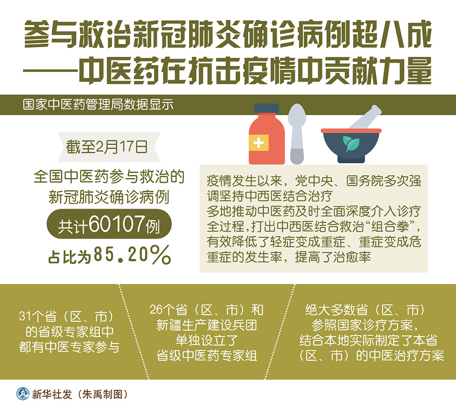 國家中醫(yī)藥管理局數(shù)據顯示,截至2月17日,全國中醫(yī)藥參與救治的新冠肺炎確診病例共計60107例,占比為85.20%。疫情發(fā)生以來,黨中央、國務院多次強調堅持中西醫(yī)結合治療。多地推動中醫(yī)藥及時全面深度介入診療全過程,打出中西醫(yī)結合救治“組合拳”,有效降低了輕癥變成重癥、重癥變成危重癥的發(fā)生率,提高了治愈率。
