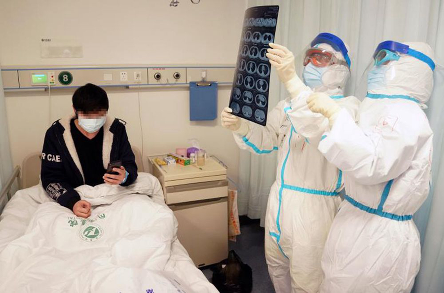 2月18日,專家趙建平(右二)與醫(yī)生周瑩在同濟(jì)醫(yī)院中法新城院區(qū)新冠肺炎重癥病區(qū),一起觀看患者的CT片。新華社記者王毓國(guó) 攝