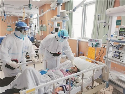 江蘇省人民醫(yī)院呼吸與危重癥醫(yī)學(xué)科副主任、主任醫(yī)師,武漢市第一醫(yī)院國家醫(yī)療隊(duì)聯(lián)合專家組組長齊栩(右一)和同事在武漢市第一醫(yī)院重癥監(jiān)護(hù)病區(qū)給危重癥患者進(jìn)行檢查。
