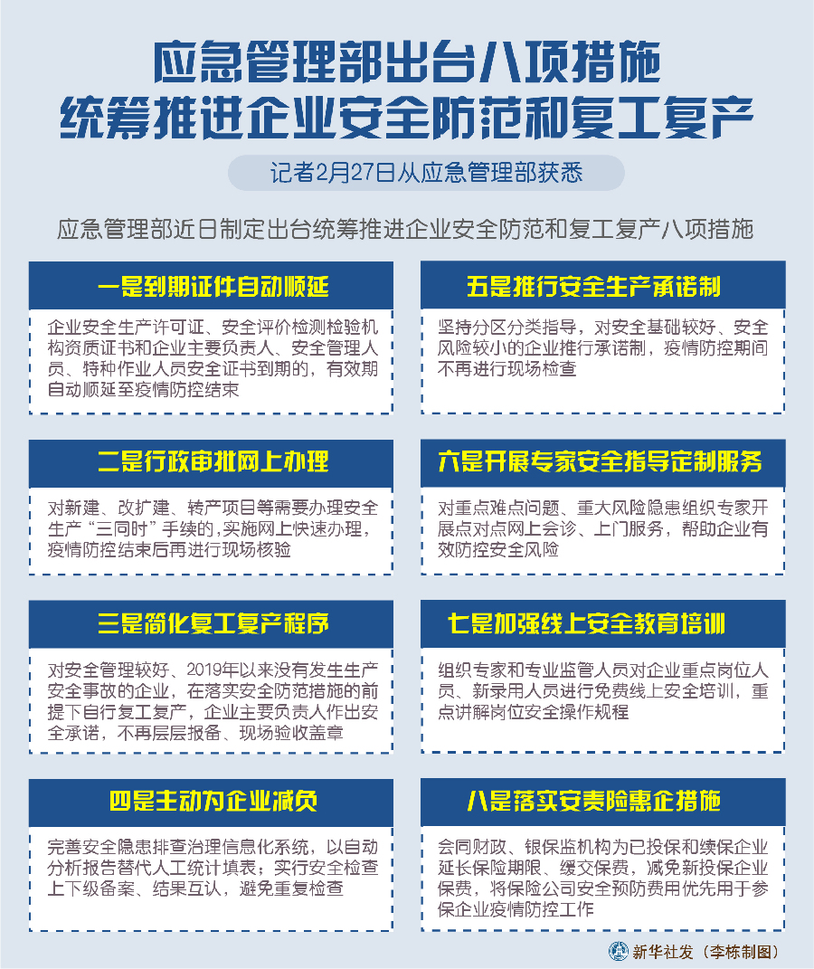 圖表:應(yīng)急管理部出臺(tái)八項(xiàng)措施 統(tǒng)籌推進(jìn)企業(yè)安全防范和復(fù)工復(fù)產(chǎn) 新華社發(fā) 李棟 制圖