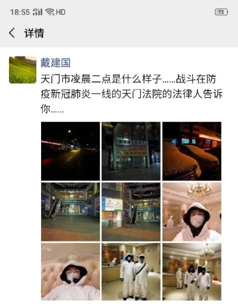 2月5日,天門市委發(fā)出全市干部職工就近參加村(社區(qū))疫情防控工作的號(hào)召后,天門法院黨組認(rèn)真組織,狠抓落實(shí)。戴建國積極響應(yīng),第一時(shí)間趕到竟陵街道辦事處鴻漸社區(qū)報(bào)到,被安排到新城集中留觀點(diǎn)某酒店值班。