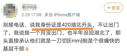 春節(jié)期間曾被輿論一致抨擊的“排鄂”現(xiàn)象,近期在有些地方死灰復燃,甚至有“加碼”跡象:多位湖北籍網民發(fā)帖稱,自己過去幾個月沒回過老家,但因為“身份證是42開頭”,社區(qū)、基層干部就以“大數(shù)據(jù)報告”為依據(jù),要求強制集中隔離;有長租企業(yè)突然通知湖北籍租客,密碼鎖已被凍結;還有企業(yè)大量解雇湖北籍員工……