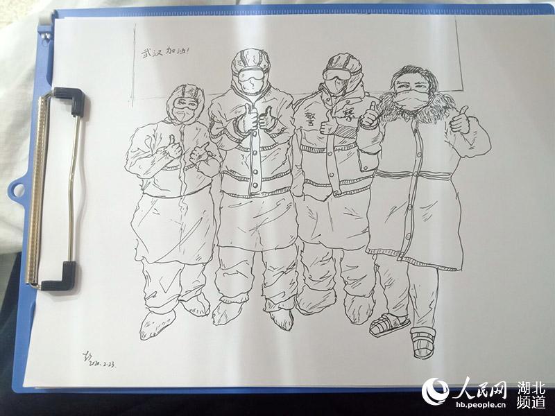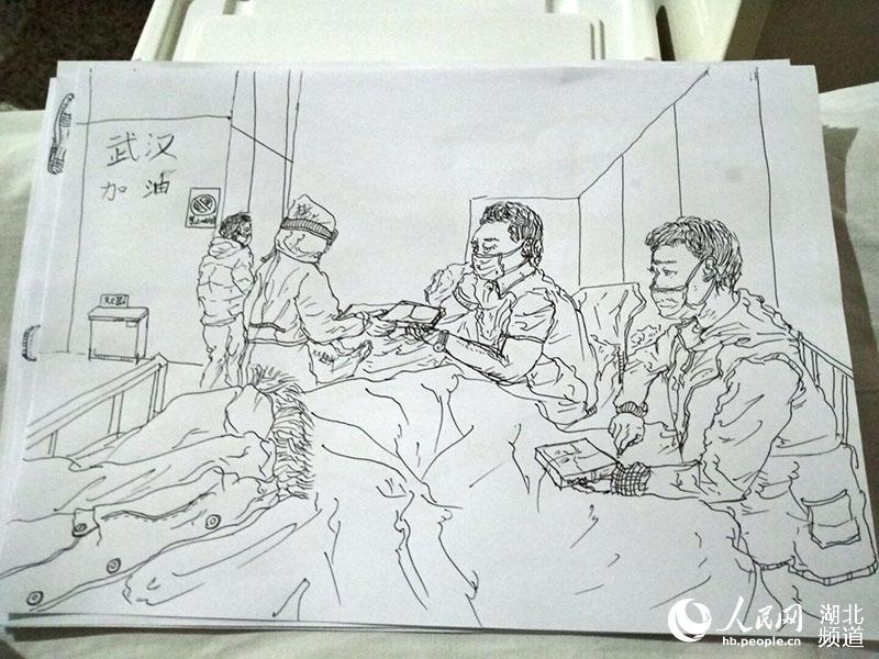 “被照顧得很好”的小彭常??吹结t(yī)護(hù)人員們穿著厚重的防護(hù)服,一忙就是6個(gè)小時(shí)以上不停歇,連水和飯都得換班以后吃,卻每天依然為患者提供無微不至的照顧。出于感動(dòng)和感激,彭昕燁向醫(yī)護(hù)人員借了紙和筆,將方艙醫(yī)院溫暖的瞬間畫成素描。