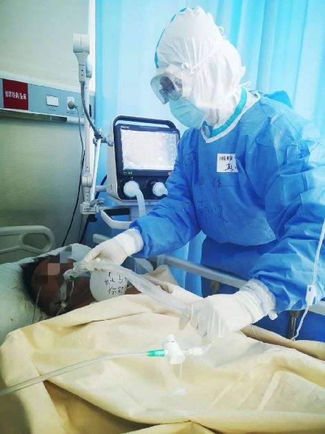 醫(yī)療隊(duì)隊(duì)員為患者上無創(chuàng)呼吸機(jī)進(jìn)行無創(chuàng)通氣支持治療