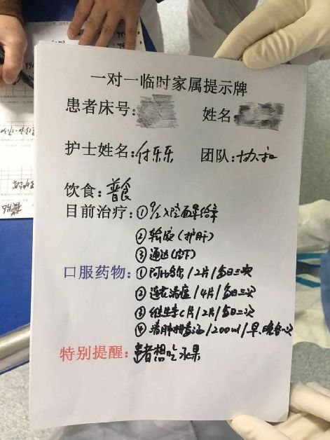 我們從人文護(hù)理的角度出發(fā),聯(lián)合武漢協(xié)和醫(yī)院成立了一支以關(guān)愛患者心理和生活的“臨時(shí)家屬”護(hù)理隊(duì)伍。三十多名名護(hù)士踴躍報(bào)名,加入到了這個(gè)有愛的隊(duì)伍中。為確保人文護(hù)理項(xiàng)目達(dá)到預(yù)期效果,病區(qū)制定了《“臨時(shí)家屬”管理規(guī)范》《人文關(guān)懷方案》。