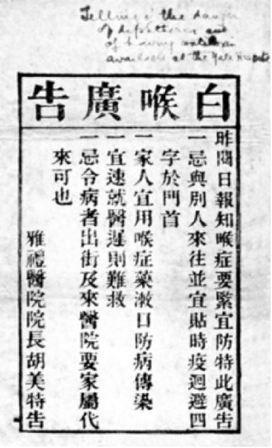 雅禮醫(yī)院院長胡美簽發(fā)的預(yù)防白喉病的廣告