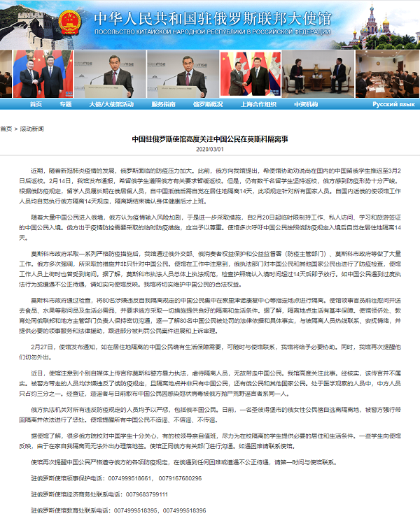 近日,使館注意到個(gè)別自媒體上傳言稱(chēng)莫斯科警方暴力執(zhí)法,虐待隔離人員,無(wú)故帶走中國(guó)公民。我館高度關(guān)注此事。經(jīng)核實(shí),該傳言并不屬實(shí)。被警方帶走的人員均涉嫌違反了俄防疫規(guī)定,且隔離地點(diǎn)并非只有中國(guó)公民,還有俄公民和其他國(guó)家公民。處于醫(yī)學(xué)觀(guān)察的人員中,中方人員只占約三分之一。經(jīng)查證,造謠者與日前散布中國(guó)公民因感染冠狀病毒被俄方拋尸荒野謠言者系同一人。
