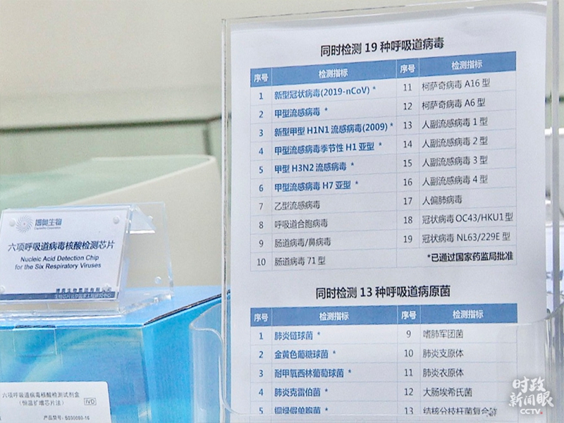 圖中藍(lán)色序號(hào)前6種呼吸道病毒,能夠被全新微流控芯片系統(tǒng)一次性檢測(cè)出來(lái)。(總臺(tái)央視記者韓銳拍攝)