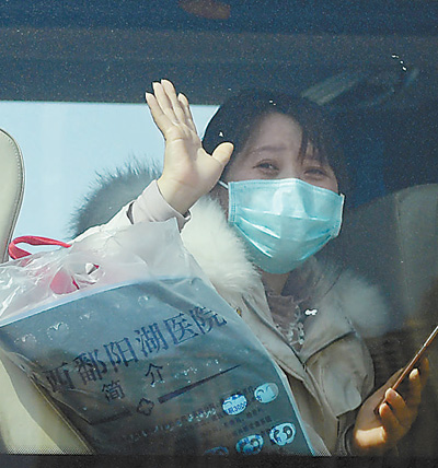 2月22日,江西中醫(yī)藥大學(xué)附屬醫(yī)院撫生院區(qū),11名此前由其他醫(yī)療機(jī)構(gòu)轉(zhuǎn)入該院的新冠肺炎患者治愈出院,其中有8人在該院接受了中醫(yī)治療,3人接受中西醫(yī)結(jié)合治療。圖為出院的病人向醫(yī)護(hù)人員揮手告別。時(shí) 雨攝(影像中國(guó))