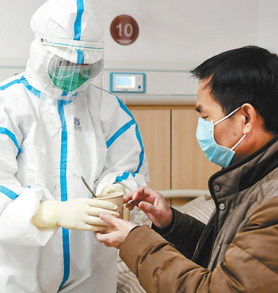 2月18日,在江西中醫(yī)藥大學(xué)附屬醫(yī)院撫生院區(qū)新冠肺炎患者的隔離病房?jī)?nèi),護(hù)士將中藥湯劑端給患者。時(shí) 雨攝(影像中國(guó))