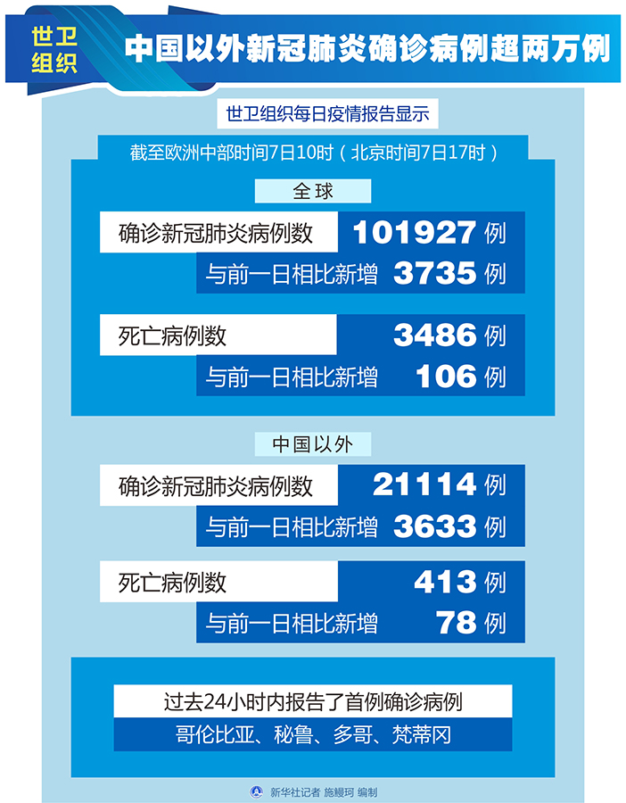 世衛(wèi)組織每日疫情報(bào)告顯示,截至歐洲中部時(shí)間7日10時(shí)(北京時(shí)間7日17時(shí)),中國(guó)以外新冠肺炎確診病例較前一日增加3633例,達(dá)到21114例;死亡病例較前一日增加78例,達(dá)到413例。