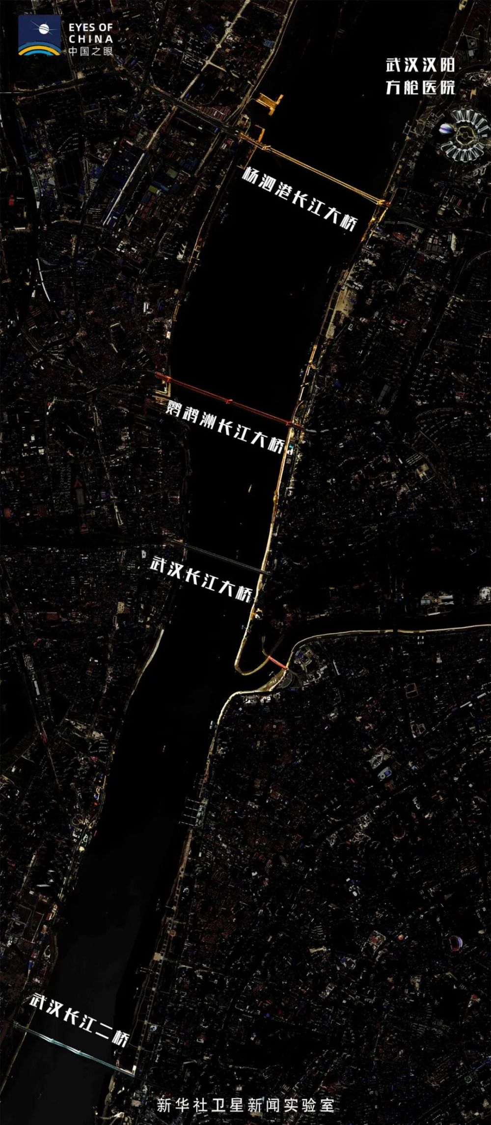 除了江漢區(qū)、硚口區(qū)、江岸區(qū)等核心城區(qū)的燈光一定程度變暗外,天河機場、武漢火車站、漢口火車站、武昌火車站等城市交通樞紐站依舊燈光閃耀,連接武漢三鎮(zhèn)的交通路網(wǎng)散發(fā)的路燈光串起了這座城市的運行脈絡,10天建成的火神山燈光由一片暗變成一片亮。
