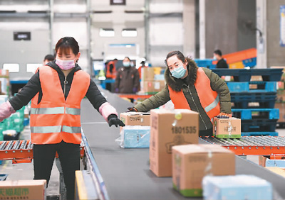 近日,位于北京市順義區(qū)的菜鳥物流倉庫在做好疫情防控的同時,穩(wěn)步有序復(fù)工復(fù)產(chǎn)。該物流倉庫目前每天處理訂單近5萬件,生產(chǎn)運(yùn)營基本恢復(fù)到日常水平。圖為3月12日,在順義區(qū)菜鳥物流倉庫,幾名員工在分揀打包的商品。