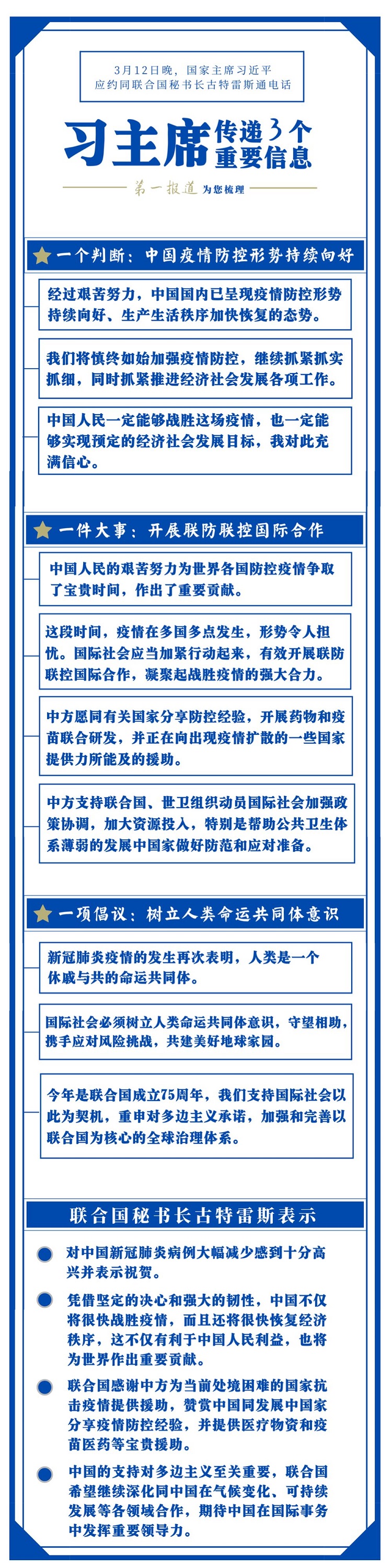 對疫情防控國際合作這件大事,習主席一直十分關(guān)心。此前,在內(nèi)外事活動中,他曾多次提及。這一次同古特雷斯通電話,習主席有更明確闡述。