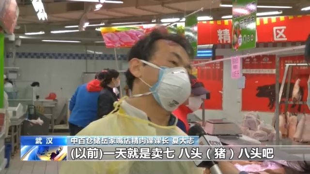 中百倉儲岳家嘴店精肉課課長 夏大志:以前賣8頭豬16片,現(xiàn)在賣15頭 30片,冷凍肉一天要賣一兩噸,箱子裝的100多箱。