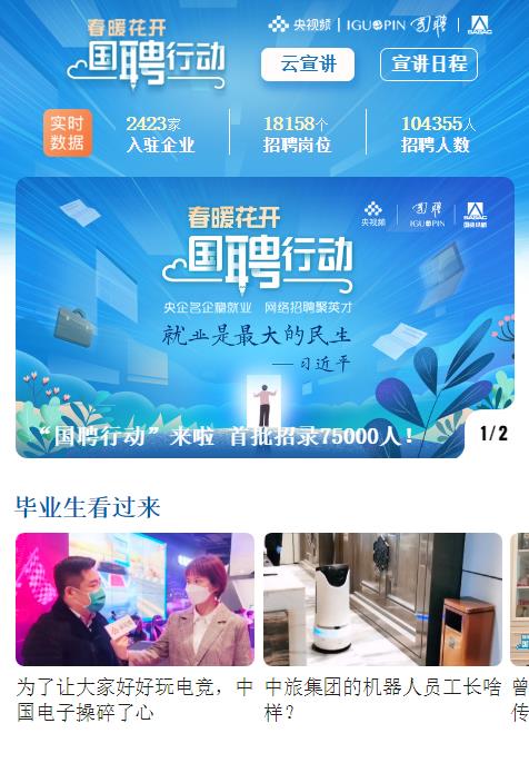用戶只需下載“央視頻”客戶端并進入“國聘行動”專題頁面,即可通過滑動掌握近2500家入駐企業(yè)的招聘信息。并可通過在線簡歷投遞等方式,直通企業(yè)人力部門,實現(xiàn)全流程“無接觸”應(yīng)聘。