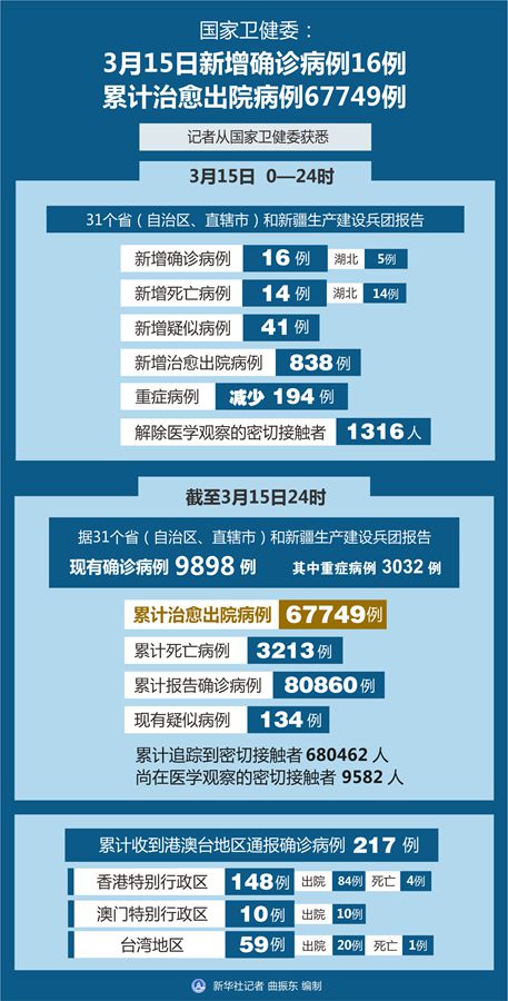 新華社北京3月16日電(記者劉紅霞、屈婷)記者16日從國家衛(wèi)生健康委員會了解到,3月15日0-24時,31個?。ㄗ灾螀^(qū)、直轄市)和新疆生產建設兵團報告新增確診病例16例,新增死亡病例14例(湖北14例),新增疑似病例41例。