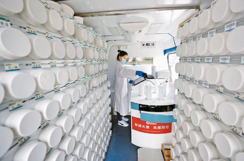 在武漢江夏方艙醫(yī)院的“流動(dòng)應(yīng)急智能中藥房”里,工作人員把盛有藥方中包含的單味藥的藥瓶取下來(lái)后,逐一掃描確認(rèn),準(zhǔn)備制藥。新華社記者 沈伯韓/攝