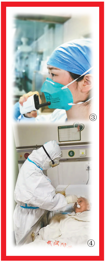 從1月3日至今,今年26歲的武漢市肺科醫(yī)院護(hù)士朱靜(圖③)已經(jīng)在ICU病房連續(xù)工作了兩個(gè)多月。