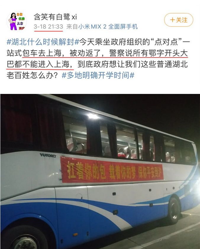 有媒體報(bào)道稱,3月18日至3月19日,多個(gè)湖北縣市的點(diǎn)對(duì)點(diǎn)大巴包車,到達(dá)上海市附近高速收費(fèi)站或高速公路后,遭遇無法進(jìn)入上海的囧境。不少返程復(fù)工人員為此等待至深夜,甚至只能在大巴車中過夜。