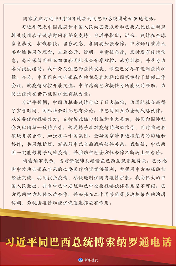 博索納羅表示,當(dāng)前新冠肺炎疫情在巴西呈現(xiàn)蔓延勢頭。巴方感謝中方為巴西在華采購必要醫(yī)療物資提供便利,希望同中方加強防控經(jīng)驗交流,共同抗擊疫情,盡快遏制住國內(nèi)疫情擴散。我向偉大的中國人民致敬,并重申巴中友誼和巴中全面戰(zhàn)略伙伴關(guān)系堅不可摧。巴方愿同中方加強雙邊合作,并加強在二十國集團等多邊框架內(nèi)的溝通協(xié)調(diào),為抗擊疫情和經(jīng)濟恢復(fù)發(fā)揮應(yīng)有作用。