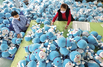 3月25日,山東臨沂沂南縣青駝鎮(zhèn)雙橋村扶貧車間農民在加工玩具。杜昱葆攝/光明圖片