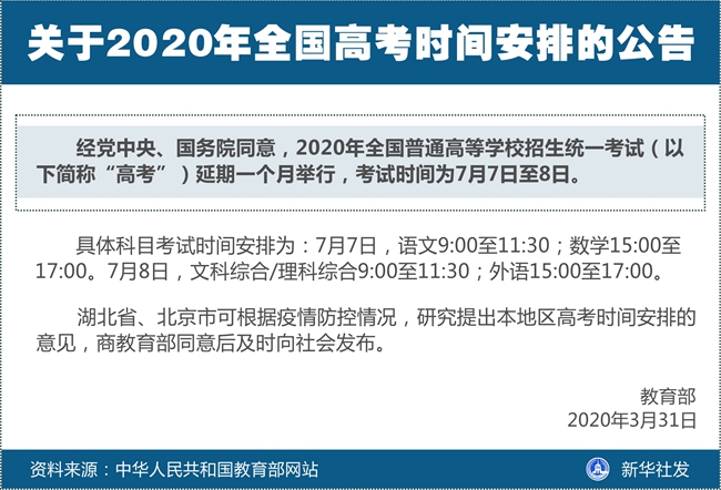新華社北京3月31日電(記者施雨岑)記者31日從教育部獲悉,經(jīng)黨中央、國務(wù)院同意,2020年全國普通高等學(xué)校招生統(tǒng)一考試延期一個月舉行,考試時間為7月7日至8日。
