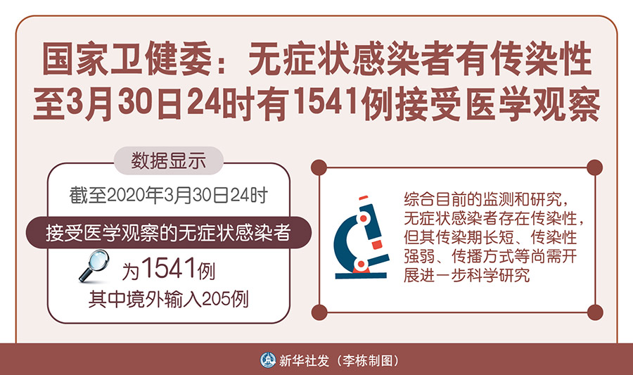 新華社北京3月31日電(記者王秉陽)國家衛(wèi)健委31日在官網(wǎng)發(fā)布《關(guān)于新型冠狀病毒無癥狀感染者的防控工作答問》,對近來網(wǎng)民熱議的無癥狀感染者相關(guān)問題進(jìn)行回答。數(shù)據(jù)顯示,截至2020年3月30日24時(shí),接受醫(yī)學(xué)觀察的無癥狀感染者為1541例,其中境外輸入205例。