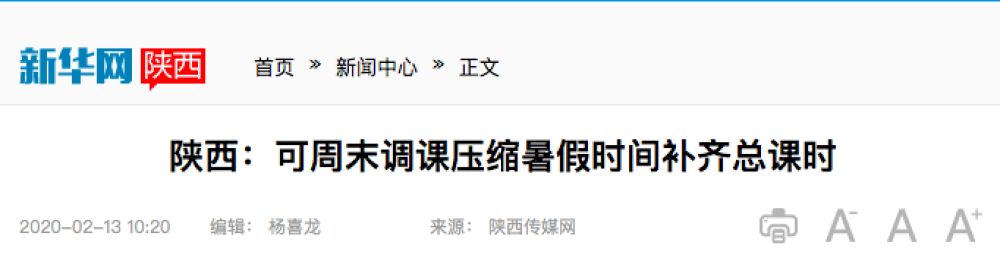 2月11日,陜西省新型冠狀病毒感染的肺炎疫情防控工作情況第十場新聞發(fā)布會上,陜西教育系統(tǒng)新冠肺炎疫情防控工作領(lǐng)導(dǎo)小組常務(wù)副組長、省委教育工委委員、省教育廳副廳長趙昶葆表示,“各地各校后續(xù)可采取周末調(diào)課、壓縮暑假時(shí)間等方式補(bǔ)齊總課時(shí)。”