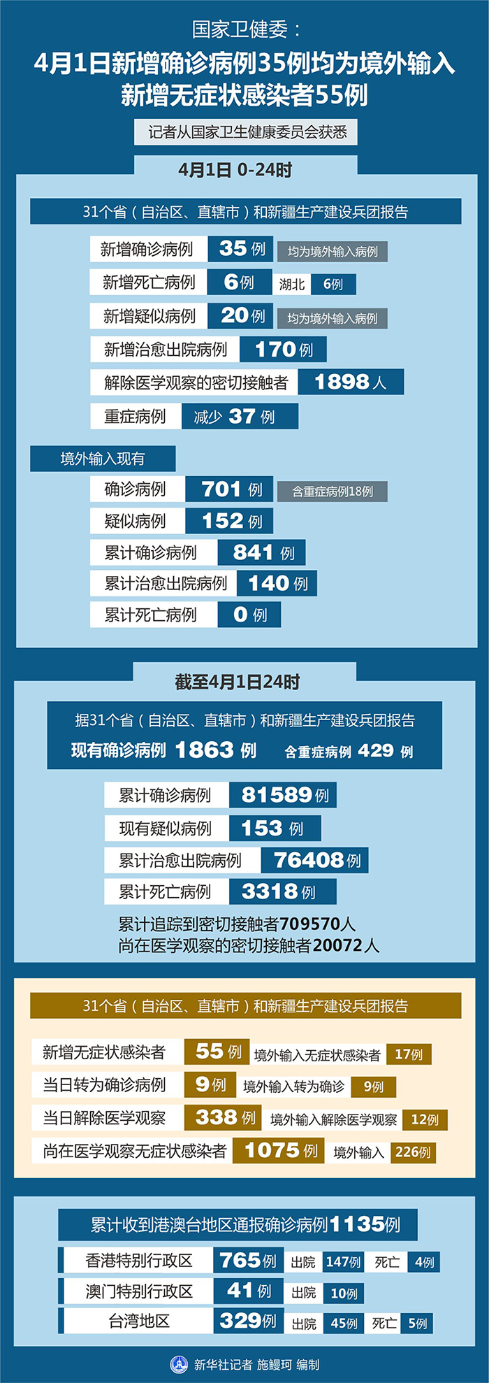截至4月1日24時,據(jù)31個?。ㄗ灾螀^(qū)、直轄市)和新疆生產(chǎn)建設兵團報告,現(xiàn)有確診病例1863例(含重癥病例429例),現(xiàn)有疑似病例153例。累計確診病例81589例,累計治愈出院病例76408例,累計死亡病例3318例,累計追蹤到密切接觸者709570人,尚在醫(yī)學觀察的密切接觸者20072人。