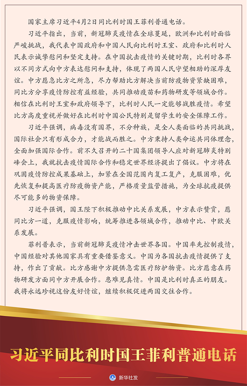 新華社北京4月2日電 國(guó)家主席習(xí)近平2日同比利時(shí)國(guó)王菲利普通電話。