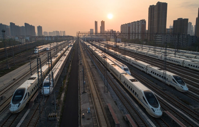在武漢動車段,列車4月8日??吭诖孳嚲€上準備投入運行(無人機照片)。新華社記者肖藝九攝