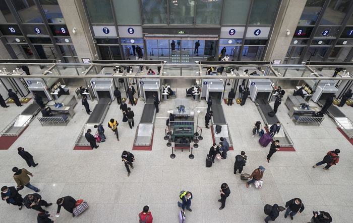 4月7日晚,旅客接受安檢后進入武昌火車站。新華社記者 費茂華 攝