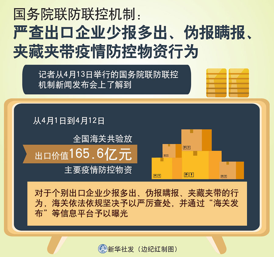 新華社北京4月13日電(記者屈婷、王鵬)記者從13日舉行的國務院聯(lián)防聯(lián)控機制新聞發(fā)布會上了解到,從4月1日到4月12日,全國海關共驗放出口價值165.6億元的主要疫情防控物資,對個別出口企業(yè)少報多出、偽報瞞報、夾藏夾帶的行為,依法依規(guī)予以嚴厲查處。