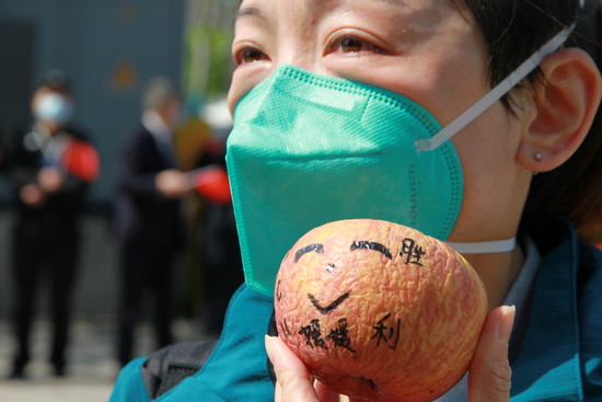 4月12日,北京協(xié)和醫(yī)療隊所負責(zé)的ICU患者清零,張媛媛松了一口氣,此時從北京帶來的蘋果已經(jīng)枯萎皺皮,她便在上面畫了一張笑臉,寫下“勝利”二字。她說,能夠把這個蘋果帶回家,意味著隊伍平安返京,而作為堅守到最后的醫(yī)療隊,她們的撤離標志著武漢的抗疫工作獲得了重大階段性勝利。