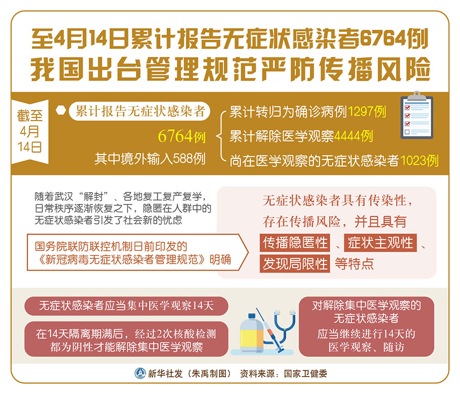 新華社北京4月15日電(記者溫競華、郁瓊源)記者從國家衛(wèi)健委獲悉,截至4月14日,累計報告無癥狀感染者6764例,其中境外輸入588例;累計轉歸為確診病例1297例,累計解除醫(yī)學觀察4444例,尚在醫(yī)學觀察的無癥狀感染者1023例。