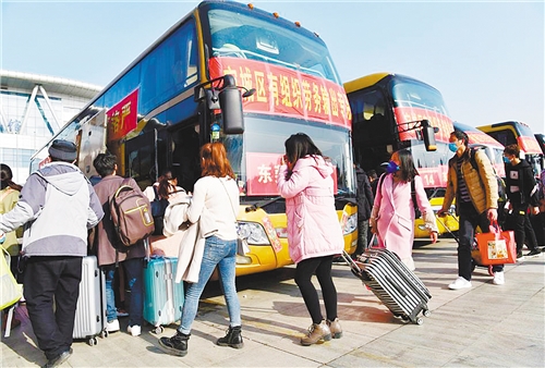 河南省南陽(yáng)市宛城區(qū)組織務(wù)工人員乘坐大巴返崗。 陳 瓊攝
