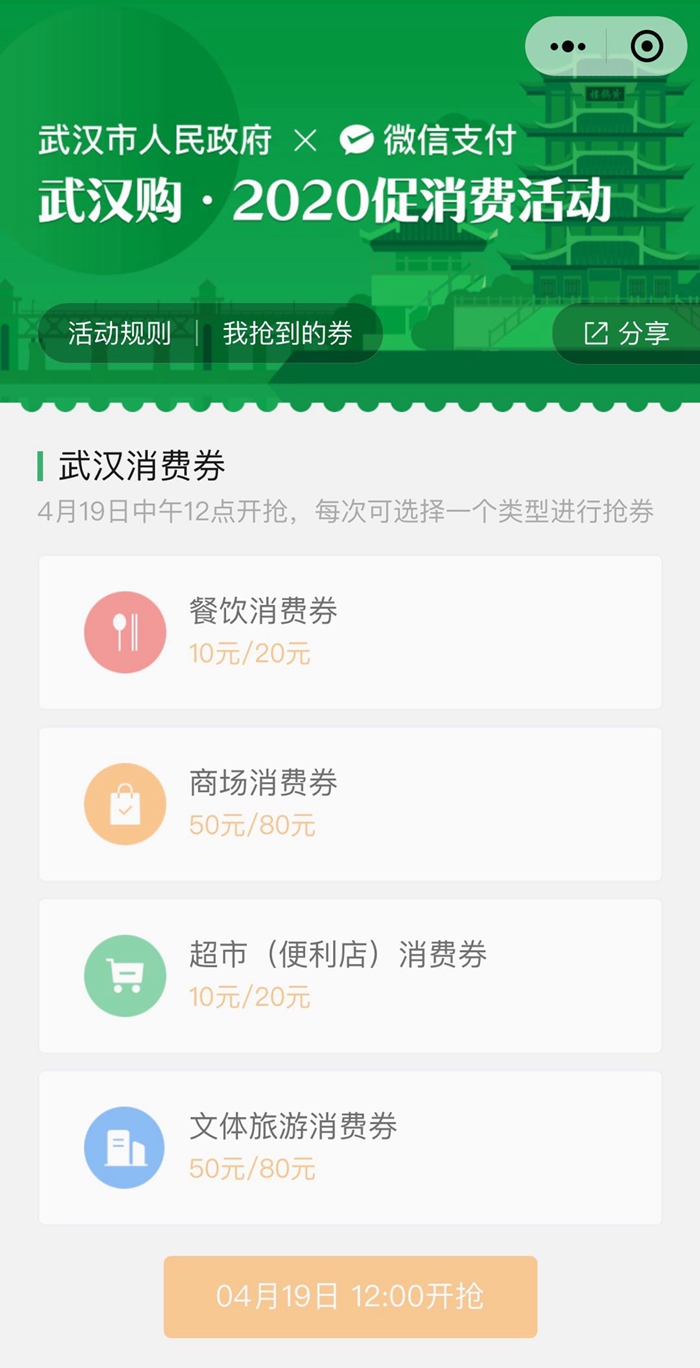 根據(jù)安排,“武漢消費(fèi)券”將在阿里巴巴、美團(tuán)點(diǎn)評(píng)、騰訊等3家企業(yè)自有線上平臺(tái)上按周投放,總體投放分兩期執(zhí)行。其中,第一期為4月19日至5月31日,首次投放活動(dòng)將在4月19日中午12時(shí)進(jìn)行,在漢人員可登錄支付寶、美團(tuán)、大眾點(diǎn)評(píng)、微信等手機(jī)程序,搜索“武漢”“消費(fèi)券”等關(guān)鍵詞進(jìn)入活動(dòng)頁面參與領(lǐng)券。第二期為6月1日至7月31日,具體投放時(shí)間另行公布。