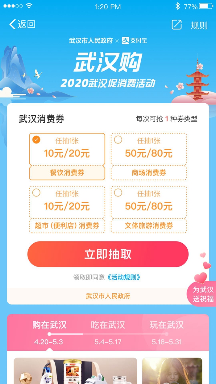 首期“武漢消費(fèi)券”根據(jù)不同消費(fèi)種類設(shè)置不同面額,其中,餐飲消費(fèi)券和超市(便利店)消費(fèi)券包含10元和20元兩種面額,商場(chǎng)消費(fèi)券和文體旅游消費(fèi)券包含50元和80元兩種面額。在漢人員每人每月在同一企業(yè)所屬平臺(tái)上領(lǐng)取的“武漢消費(fèi)券”累計(jì)核銷總額不得超過100元,整個(gè)活動(dòng)(兩期內(nèi))累計(jì)核銷總額不超過200元,3個(gè)平臺(tái)累計(jì)核銷總額不超過600元。