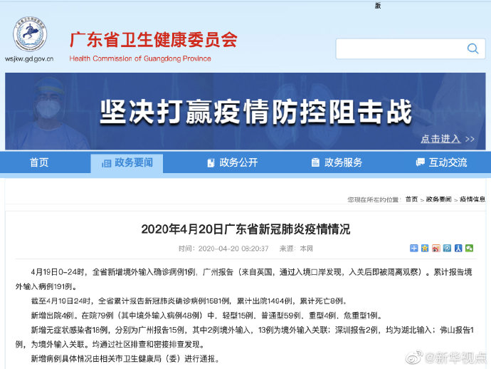 4月19日0-24時(shí),全省新增境外輸入確診病例1例,廣州報(bào)告(來自英國(guó),通過入境口岸發(fā)現(xiàn),入關(guān)后即被隔離觀察)。累計(jì)報(bào)告境外輸入病例191例。