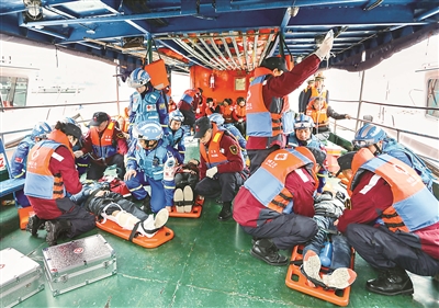 圖為重慶市水上緊急醫(yī)學(xué)救援隊(duì)的救援人員在“事故船”上對(duì)傷員進(jìn)行緊急醫(yī)療救援處置演練。新華社記者 劉潺 攝