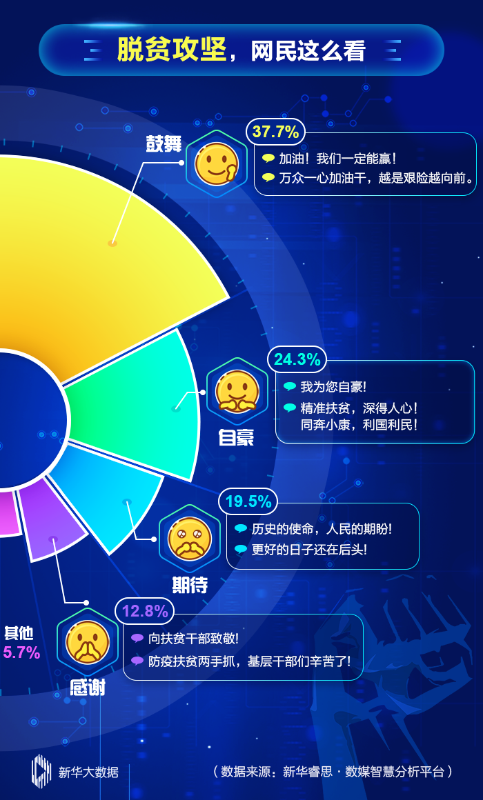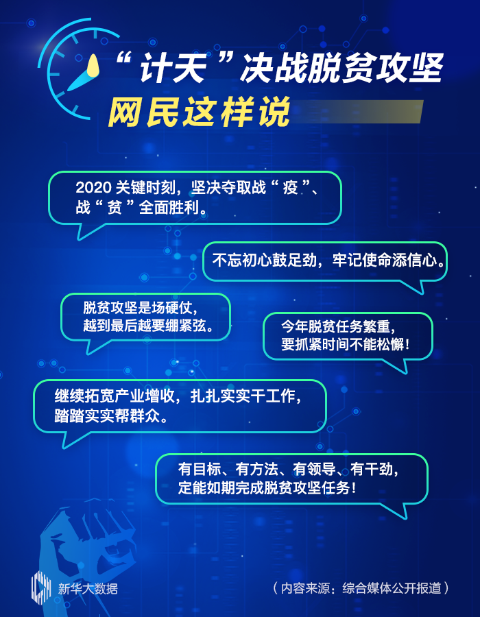 數(shù)據(jù)顯示,倒計時沖鋒之際,網(wǎng)民對脫貧攻堅非常關注。有網(wǎng)民留言稱:今年脫貧任務繁重,要抓緊時間不能松懈;也有網(wǎng)民留言表示要扎扎實實干工作;還有網(wǎng)民留言表達對完成目標任務的信心:2020關鍵時刻,堅決奪取戰(zhàn)“疫”、戰(zhàn)“貧”全面勝利。