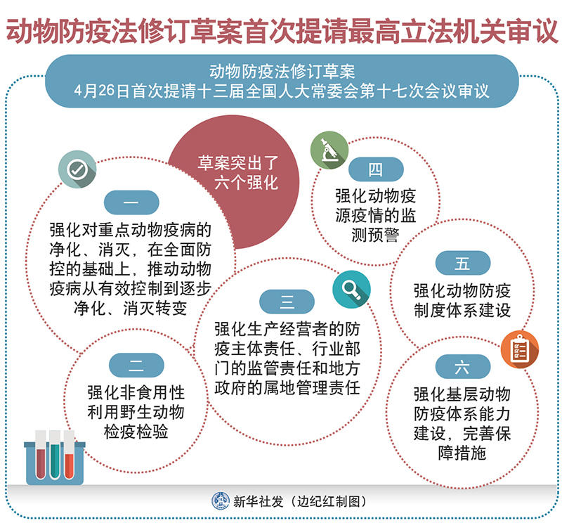 新華社北京4月26日電(記者胡璐)動(dòng)物防疫法修訂草案26日首次提請十三屆全國人大常委會(huì)第十七次會(huì)議審議。草案按照全面提升動(dòng)物衛(wèi)生水平的目標(biāo),對動(dòng)物防疫方針、防疫責(zé)任體系、制度體系、監(jiān)管體系等調(diào)整完善,構(gòu)建科學(xué)、合理、健全的動(dòng)物防疫法律制度。