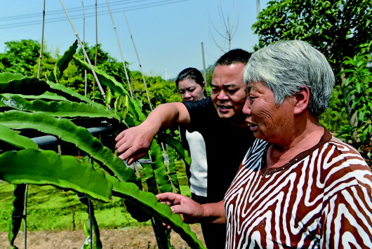 4月26日,廈門海滄青礁村院前社理事長(zhǎng)陳俊雄(中)在指導(dǎo)村民種植火龍果。 照片均由本報(bào)記者魏培全拍攝