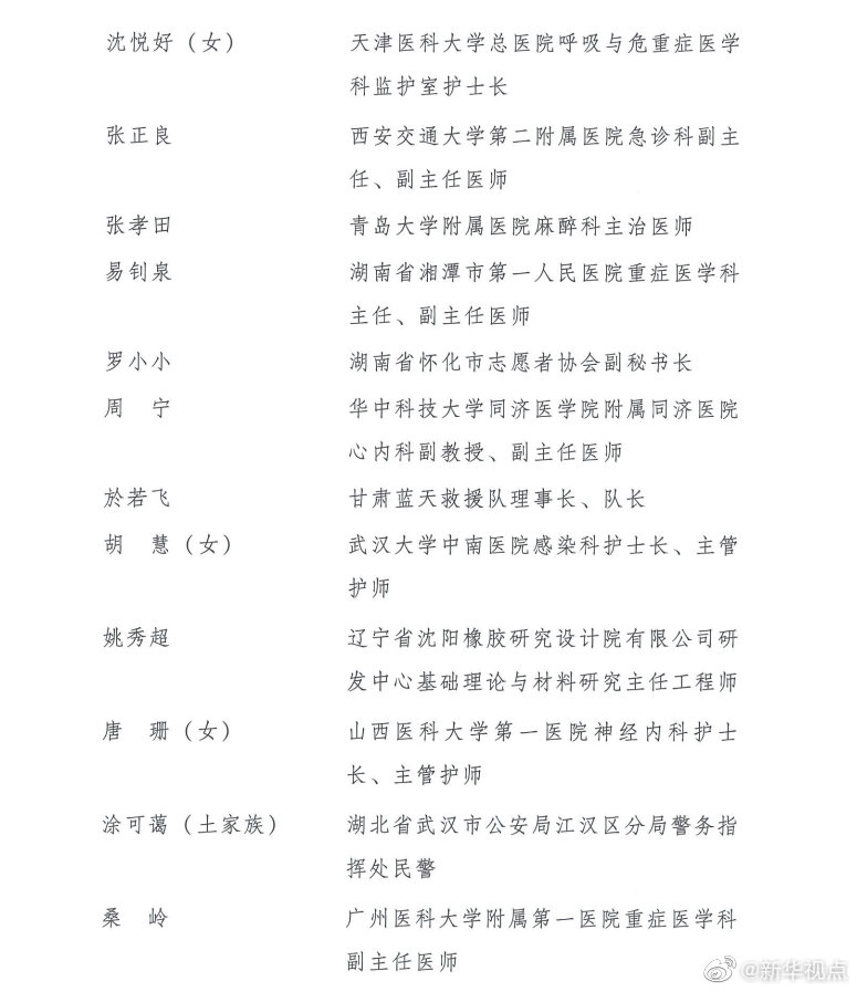 榮獲第24屆“中國青年五四獎(jiǎng)?wù)隆钡姆謩e是:江蘇省南京市鼓樓區(qū)方家營消防救援站站長助理、三級(jí)消防長丁良浩,安徽省滁州市定遠(yuǎn)縣吳圩鎮(zhèn)西孔村黨總支第一書記王萌萌(女),廈門大學(xué)航空航天學(xué)院常務(wù)副院長、特聘教授、博士生導(dǎo)師尤延鋮,湖北省黃岡市羅田縣希望小學(xué)校長方榮(女),浙江每日互動(dòng)網(wǎng)絡(luò)科技股份有限公司董事長兼總經(jīng)理、黨委書記方毅,浙江省杭州市拱墅區(qū)職業(yè)高級(jí)中學(xué)美發(fā)專業(yè)教師石丹(女),國家超級(jí)計(jì)算無錫中心副主任付昊桓,中國石油大港油田公司第二采油廠作業(yè)二區(qū)注采二組副組長馮萌萌(女),寧夏回族自治區(qū)石嘴山市中醫(yī)醫(yī)院副主任醫(yī)師朱斌,中國國家女子排球隊(duì)隊(duì)員、隊(duì)長朱婷(女),95072部隊(duì)參謀部訓(xùn)練處正團(tuán)職飛行技術(shù)檢查主任劉飛,廣西壯族自治區(qū)玉林市博白縣桂源農(nóng)牧有限公司總經(jīng)理劉入源,貴州省黔西南州望謨縣實(shí)驗(yàn)高中黨總支副書記、副校長劉秀祥,哈爾濱工業(yè)大學(xué)體育部副教授張虹(女),遼寧省沈陽造幣有限公司鉗工高級(jí)技師、維修班班長張文良(滿族),北京市朝陽區(qū)青少年指導(dǎo)服務(wù)中心主任張曉菲(女),吉林省超凡夢想公益基金會(huì)理事長張超凡(女),中國科學(xué)院計(jì)算技術(shù)研究所所長助理、研究員、博士生導(dǎo)師陳云霽,武警部隊(duì)某部特戰(zhàn)訓(xùn)練大隊(duì)代理大隊(duì)長陳玉浩,中山大學(xué)中山眼科中心副主任、研究員林浩添,四川省廣元市青川縣恒豐食用菌種植專業(yè)合作社理事長、青川海伶山珍商貿(mào)有限責(zé)任公司總經(jīng)理趙海伶(女),航空工業(yè)哈爾濱飛機(jī)工業(yè)集團(tuán)有限公司數(shù)控銑工秦世俊,92950部隊(duì)飛行一大隊(duì)大隊(duì)長袁偉,中鐵二局磨萬鐵路第Ⅵ標(biāo)項(xiàng)目經(jīng)理部第一分部二工區(qū)工區(qū)長、高級(jí)工程師徐州,博奧賽斯(天津)生物科技有限公司董事長欒大偉,港珠澳大橋管理局副總工程師、教授級(jí)高級(jí)工程師景強(qiáng),湖北省咸寧市崇陽縣白霓鎮(zhèn)大市村黨支部書記程桔(女),山東省七兵堂集團(tuán)股份有限公司董事長、黨支部書記謝清森,江蘇蘇寧物流有限公司快遞員潘虎,南京大學(xué)醫(yī)學(xué)院附屬鼓樓醫(yī)院腫瘤科行政副主任、南京大學(xué)臨床腫瘤學(xué)研究所副所長、博士生導(dǎo)師魏嘉(女),中國醫(yī)科大學(xué)附屬第一醫(yī)院重癥醫(yī)學(xué)科黨支部書記、副主任,教授、主任醫(yī)師丁仁彧,內(nèi)蒙古自治區(qū)第四醫(yī)院護(hù)士長、副主任護(hù)師王穎麗(女、蒙古族),四川省醫(yī)學(xué)科學(xué)院·四川省人民醫(yī)院EICU副主任醫(yī)師鄧?yán)?,浙江省杭州市中醫(yī)院重癥監(jiān)護(hù)室副護(hù)士長朱佳清(女),江蘇康為世紀(jì)生物科技有限公司總經(jīng)理、黨支部書記莊志華(女),首都醫(yī)科大學(xué)附屬北京友誼醫(yī)院重癥醫(yī)學(xué)科主任助理、副主任醫(yī)師劉壯,中建深圳裝飾有限公司項(xiàng)目經(jīng)理劉鋮,重慶醫(yī)科大學(xué)附屬第一醫(yī)院呼吸與危重癥醫(yī)學(xué)科副主任醫(yī)師、副教授劉煜亮,青海省人民醫(yī)院重癥醫(yī)學(xué)科護(hù)士長、主管護(hù)師孫曉林(女),湖北省武漢市漢陽區(qū)龍陽街芳草社區(qū)黨支部書記、居委會(huì)主任杜云(女),福建省疾病預(yù)防控制中心免疫規(guī)劃所主管技師李東,中國鐵路南昌局集團(tuán)有限公司南昌疾病預(yù)防控制所消殺科科長楊波,河北中醫(yī)學(xué)院第一附屬醫(yī)院(河北省中醫(yī)院)護(hù)師肖思孟(女、滿族),北京協(xié)和醫(yī)學(xué)院教授、中國醫(yī)學(xué)科學(xué)院腫瘤醫(yī)院研究員吳晨(女),中國寶武武漢武鋼綠色城市技術(shù)發(fā)展有限公司海綿公司工程技術(shù)部部長何航,湖北順豐速運(yùn)有限公司分部經(jīng)理汪勇,天津醫(yī)科大學(xué)總醫(yī)院呼吸與危重癥醫(yī)學(xué)科監(jiān)護(hù)室護(hù)士長沈悅好(女),西安交通大學(xué)第二附屬醫(yī)院急診科副主任、副主任醫(yī)師張正良,青島大學(xué)附屬醫(yī)院麻醉科主治醫(yī)師張孝田,湖南省湘潭市第一人民醫(yī)院重癥醫(yī)學(xué)科主任、副主任醫(yī)師易釗泉,湖南省懷化市志愿者協(xié)會(huì)副秘書長羅小小,華中科技大學(xué)同濟(jì)醫(yī)學(xué)院附屬同濟(jì)醫(yī)院心內(nèi)科副教授、副主任醫(yī)師周寧,甘肅藍(lán)天救援隊(duì)理事長、隊(duì)長於若飛,武漢大學(xué)中南醫(yī)院感染科護(hù)士長、主管護(hù)師胡慧(女),遼寧省沈陽橡膠研究設(shè)計(jì)院有限公司研發(fā)中心基礎(chǔ)理論與材料研究主任工程師姚秀超,山西醫(yī)科大學(xué)第一醫(yī)院神經(jīng)內(nèi)科護(hù)士長、主管護(hù)師唐珊(女),湖北省武漢市公安局江漢區(qū)分局警務(wù)指揮處民警涂可藹(土家族),廣州醫(yī)科大學(xué)附屬第一醫(yī)院重癥醫(yī)學(xué)科副主任醫(yī)師桑嶺,湖北省武漢市第三醫(yī)院重癥醫(yī)學(xué)科副主任醫(yī)師董芳(女),東南大學(xué)附屬中大醫(yī)院重癥醫(yī)學(xué)科主任醫(yī)師潘純。